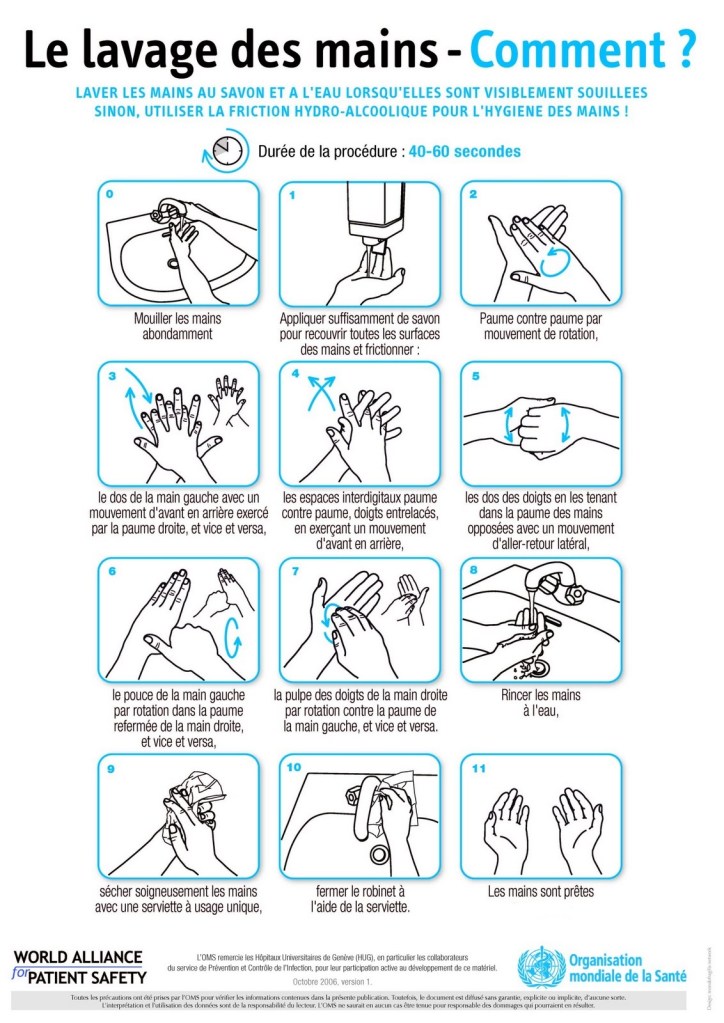 - Nettoyage des mains à l’eau et au savon avant et après chaque soin, et avec un produit hydro-alcoolique.
