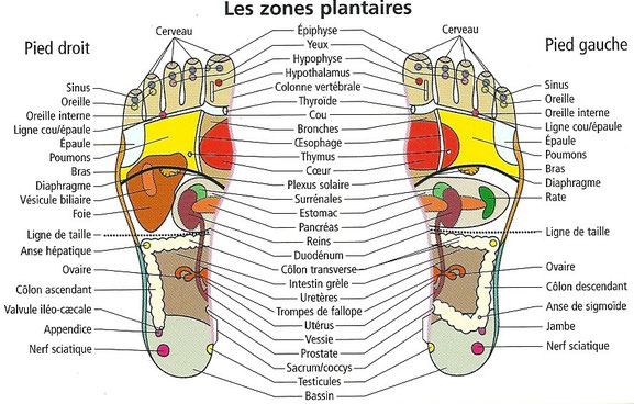 Ces zones dites « zones réflexes» vont de la tête aux pieds et aboutissent dans les orteils. De cette manière, les terminaisons nerveuses des organes atterrissent dans les pieds. En d’autres termes, le massage précis des pieds aurait un effet stimulant sur les organes internes.